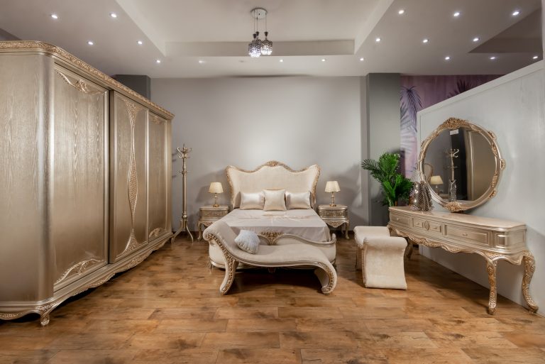 يعزز التصميم الإحساس بالنبل والفخامة،من خلال المنحنيات الناعمة والألوان اللامعة والأقمشة الحريرية والهيكل البيط للغرفة.