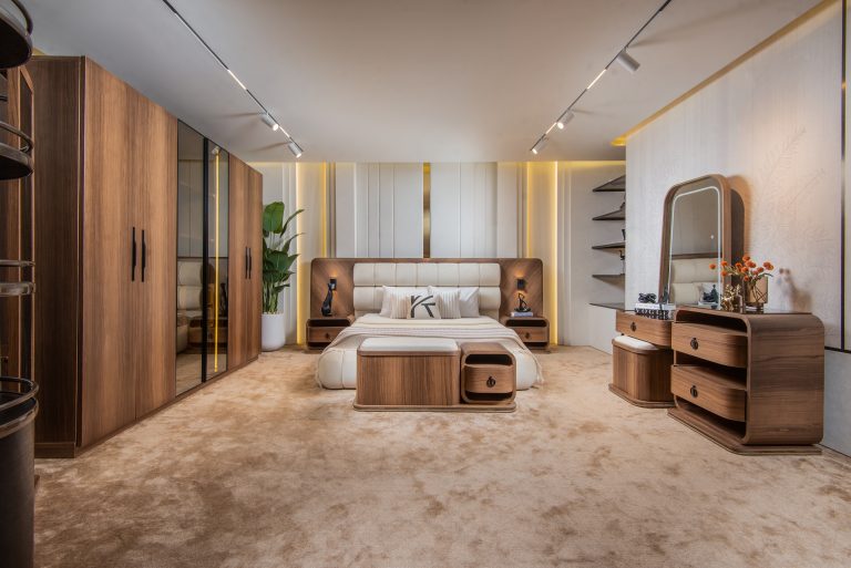 يعزز التصميم الإحساس بالنبل والفخامة،من خلال المنحنيات الناعمة والألوان اللامعة والأقمشة الحريرية والهيكل البيط للغرفة.