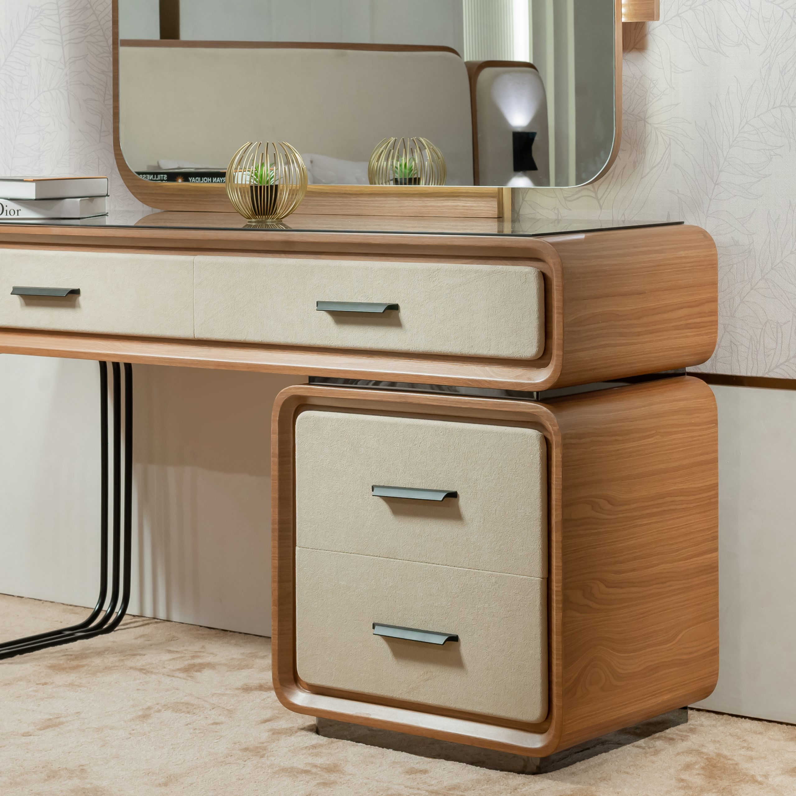 مع خطوط منحنية ناعمة، وأدراج عملية سلسة بمقابض ذهبية فاخرة، وسطح رخامي أملس يتماشى مع المرآة المستديرة الأنيقة بالمنتصف، فإن تسريحة دياتوفر الأناقة والحداثة بشكل مثالي و ساحر.