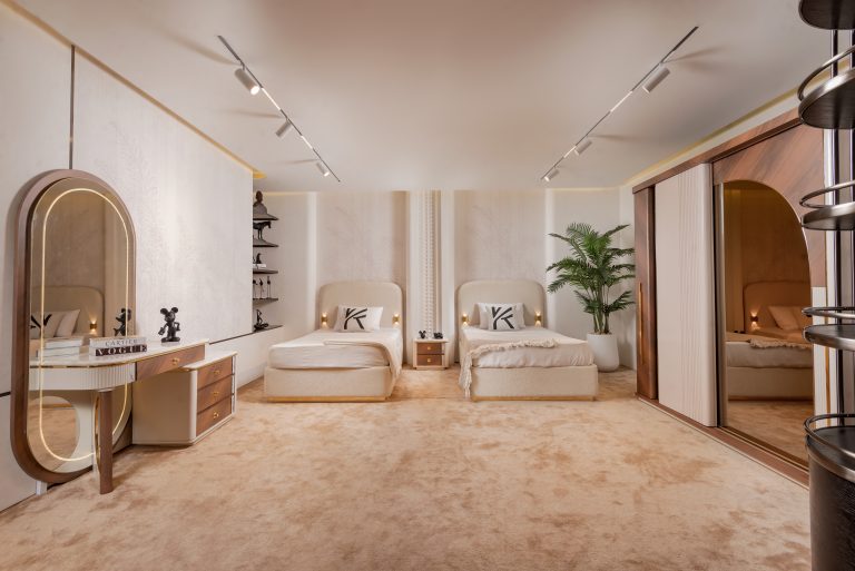 يعزز التصميم الإحساس بالنبل والفخامة،من خلال المنحنيات الناعمة والألوان اللامعة والأقمشة الحريرية والهيكل البيط للغرفة.