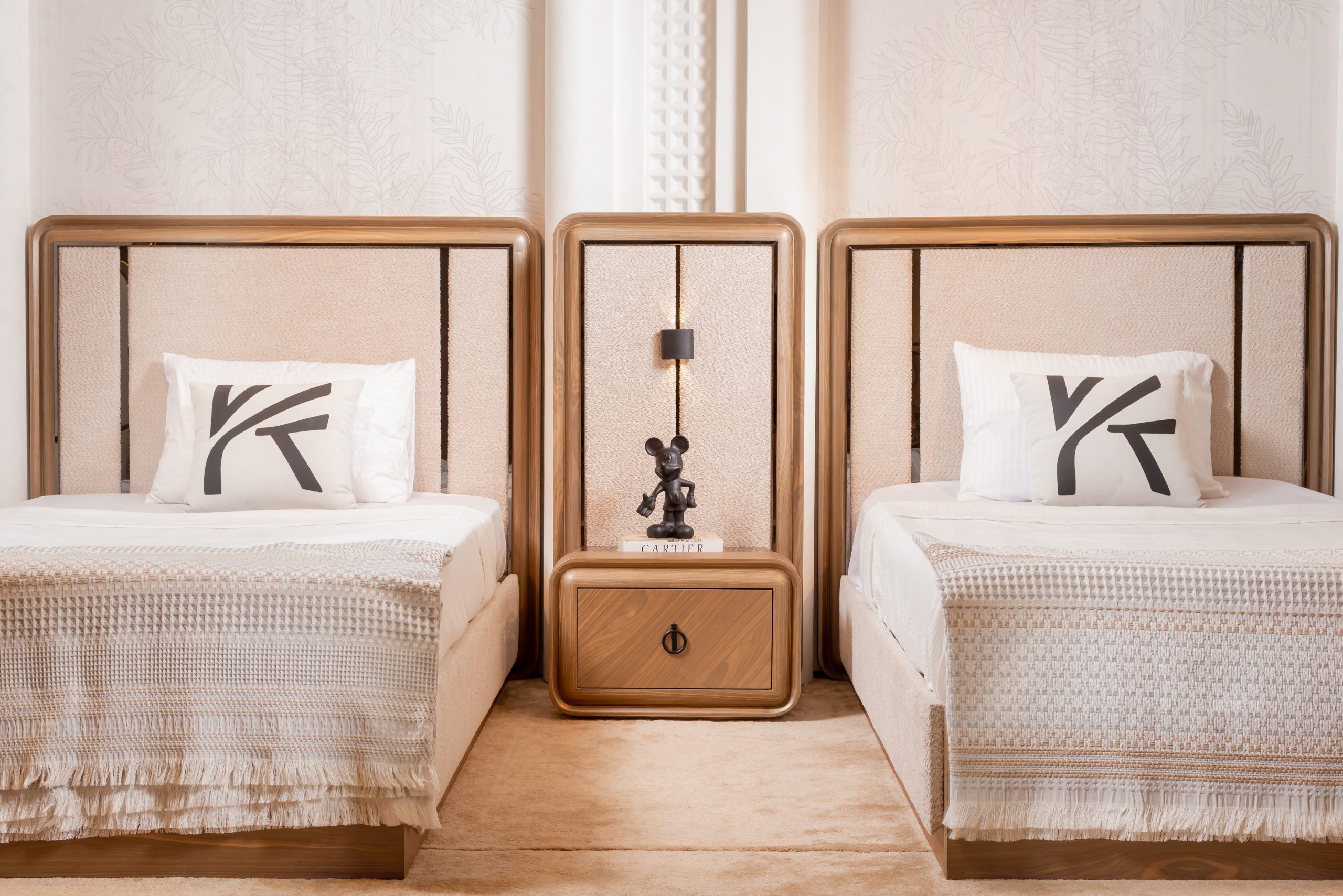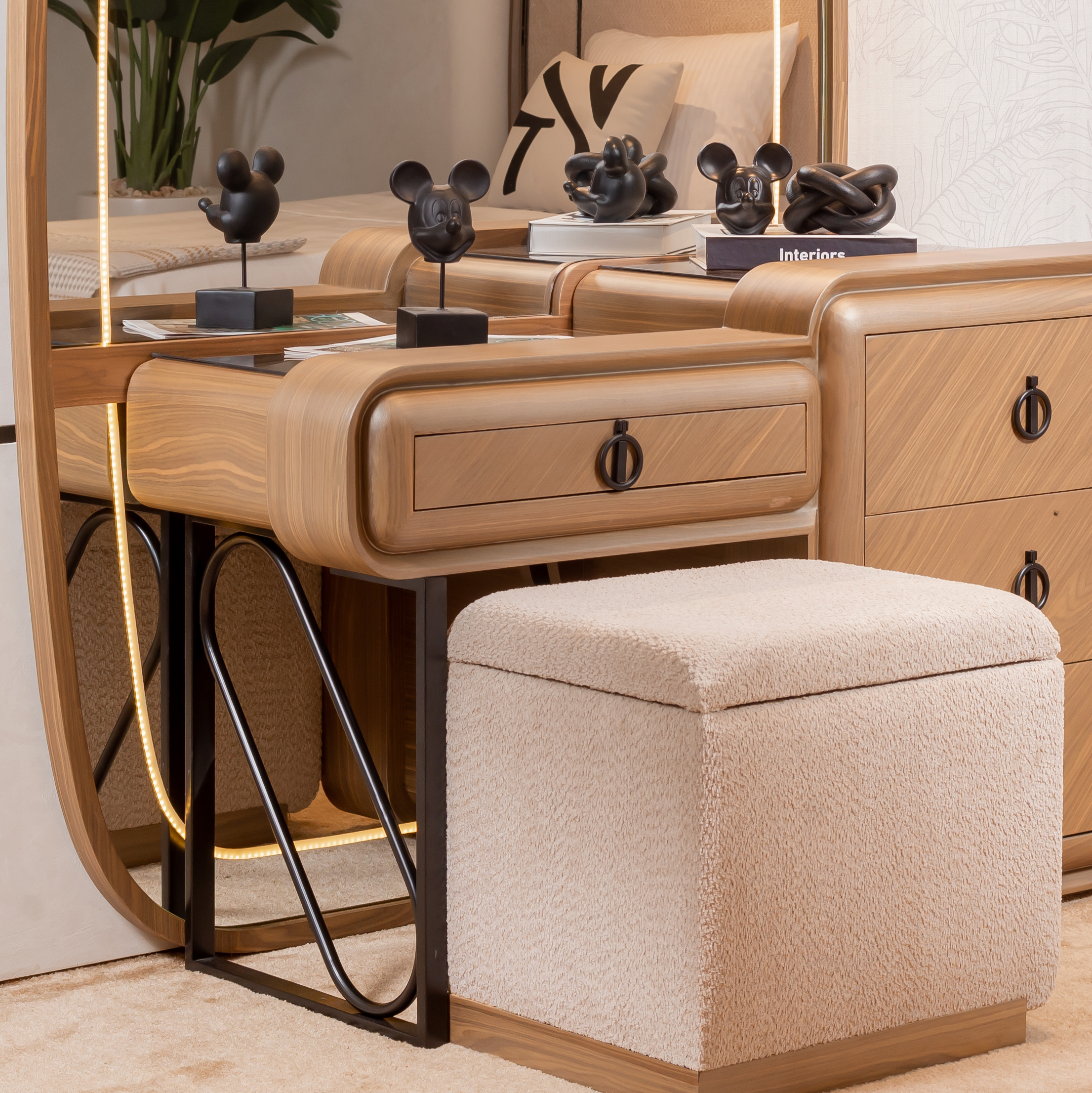 The abstract design, with smooth velvet beige fabric and masterful craftsmanship, make the pouffe a modish and practical asset for modern bedrooms.