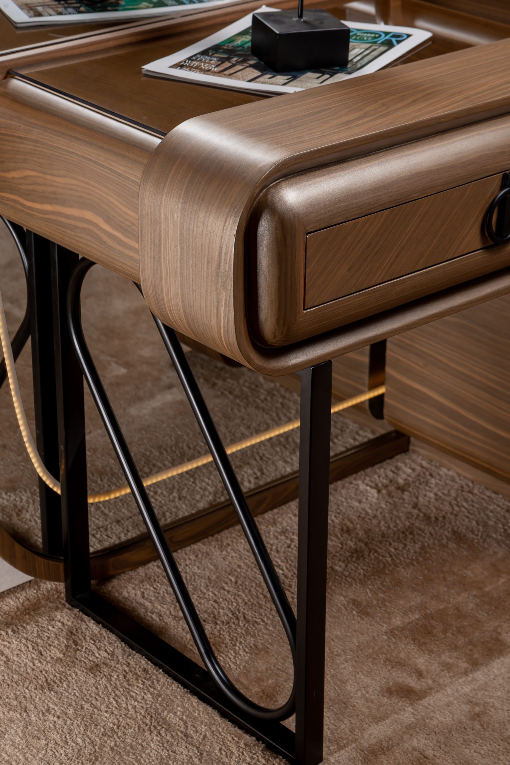 The practical handle and masterful craftsmanship ensure usability and elegance, along with the straight lines and rich wooden texture, which foster opulence and modernity.