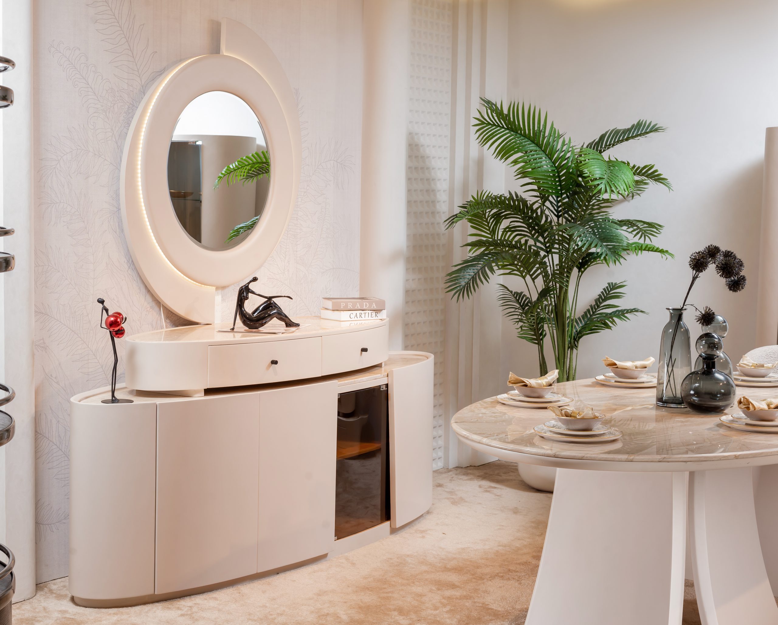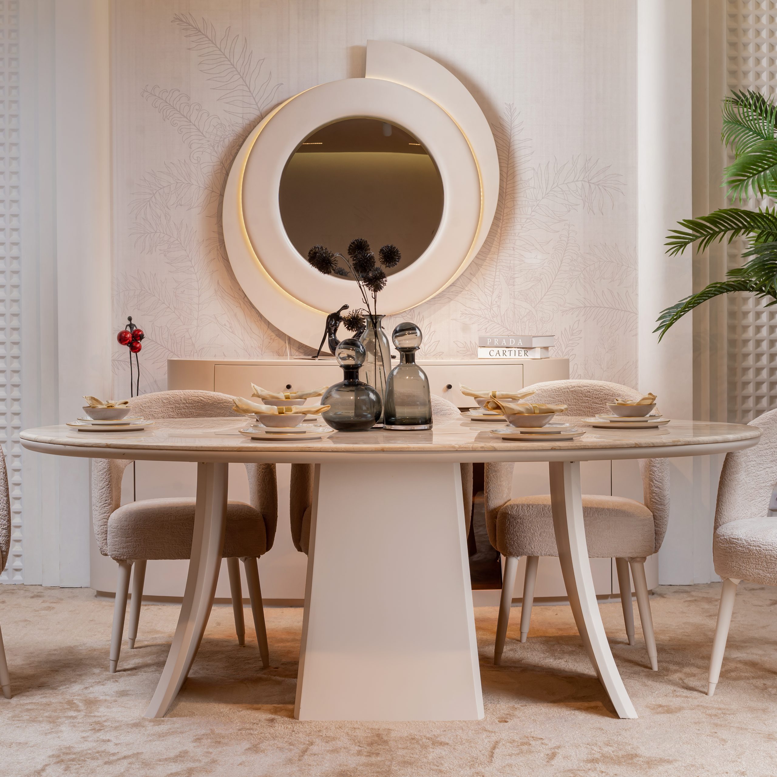 Along with the prominent, deep lines that decorate chairs’ back, aligned with the velvet sleek fabrics and almond wood surrounding the dining table with genuine setting.
